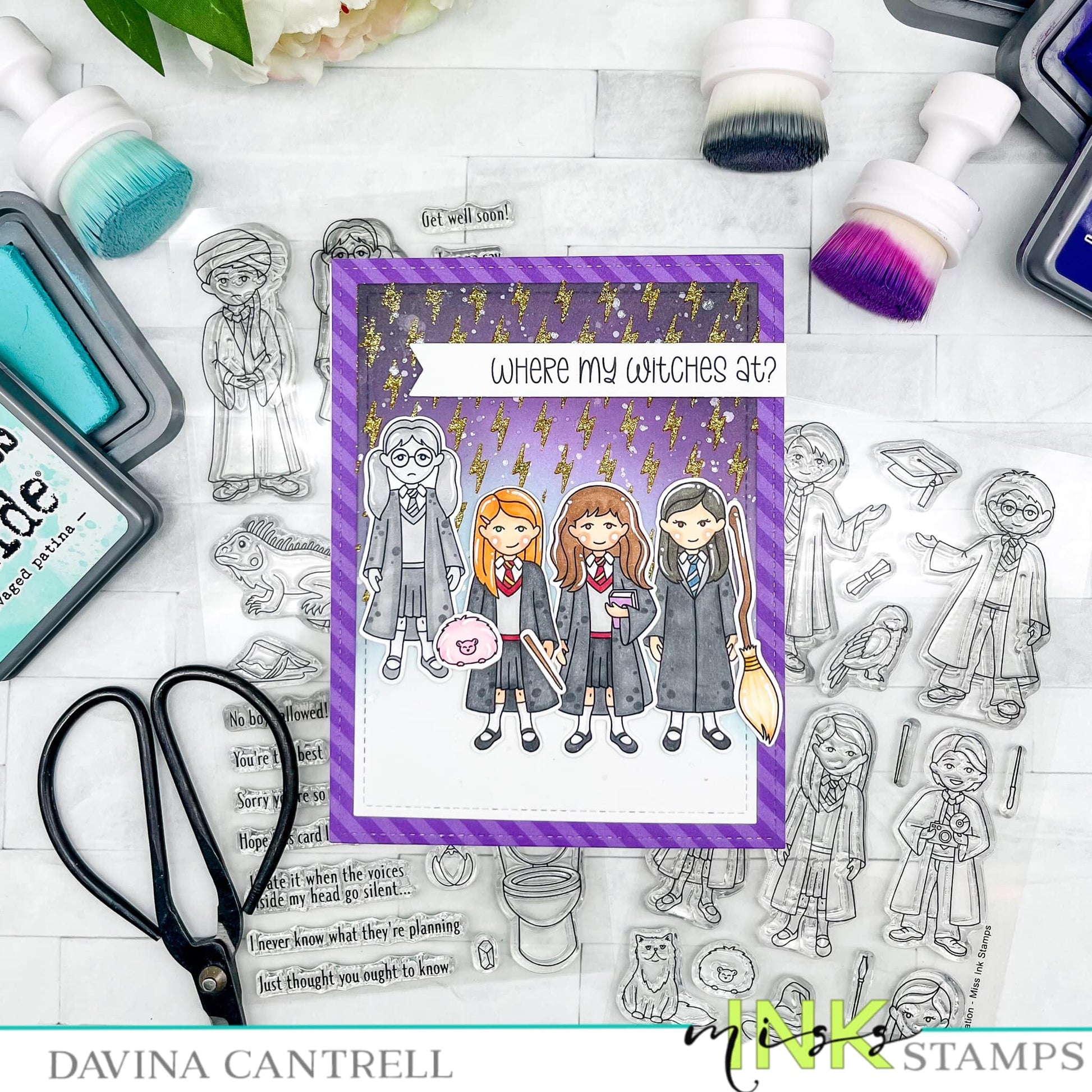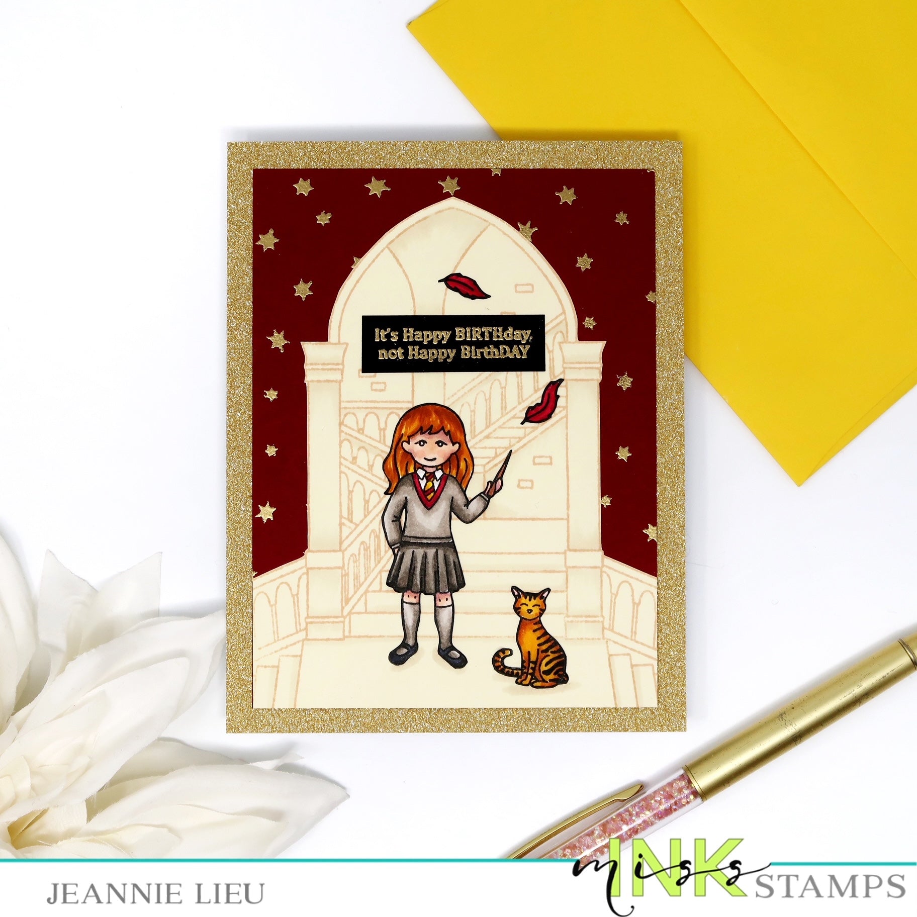 This 4x8 inch clear stamp set features a variety of students in their robes, ready to practice magic or get a diploma, along with pets, accessories and sentiments.