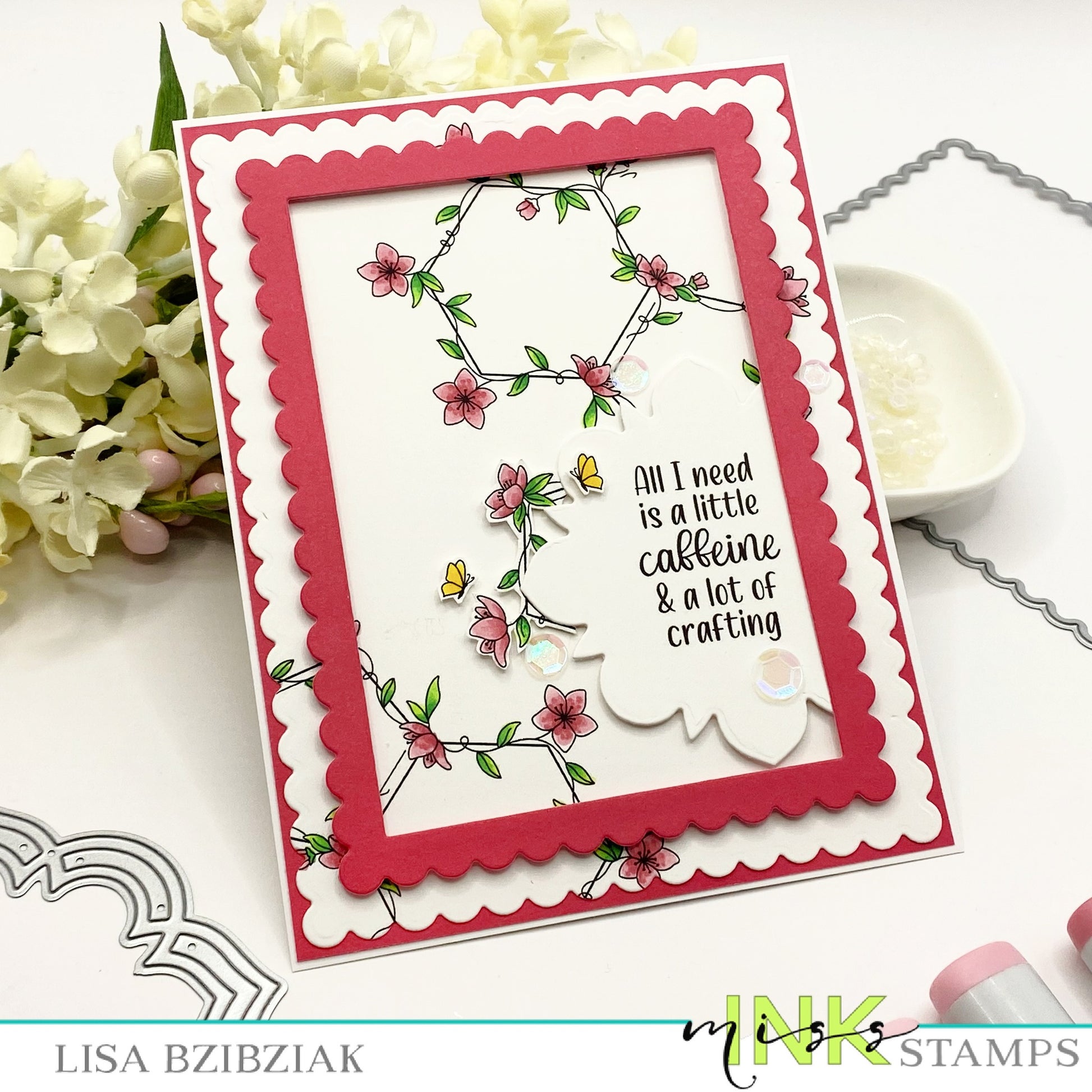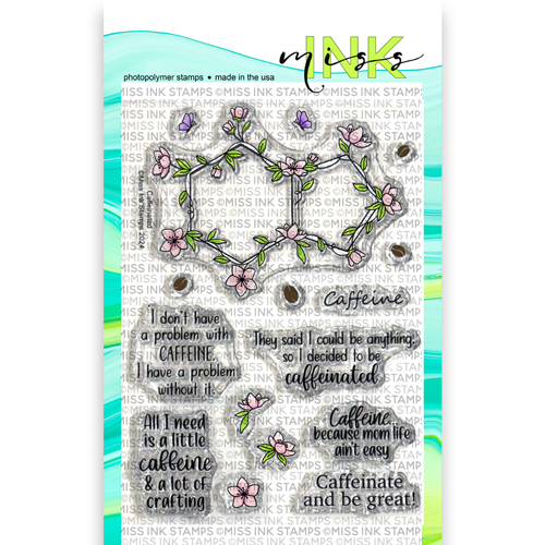 This 4x6" stamp set features a floral caffeine molecule with 5 caffeine sentiments, coffee beans, butterflies and extra flower images,