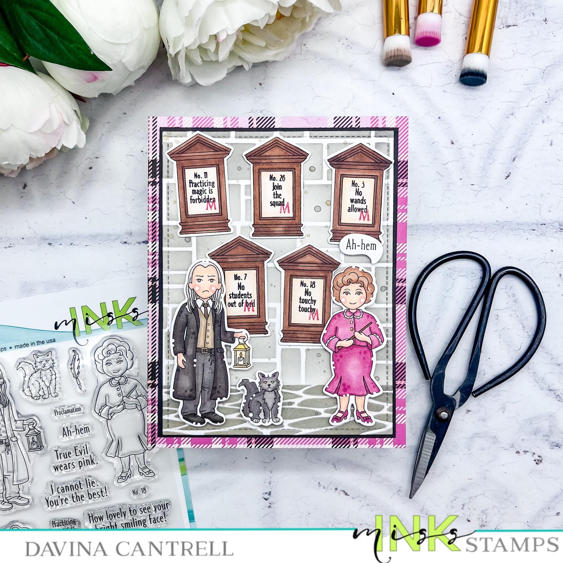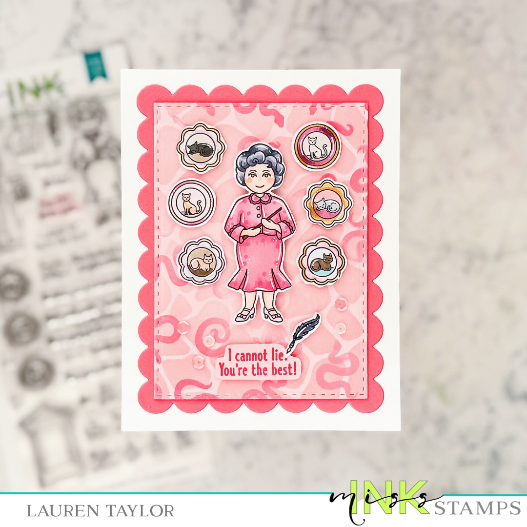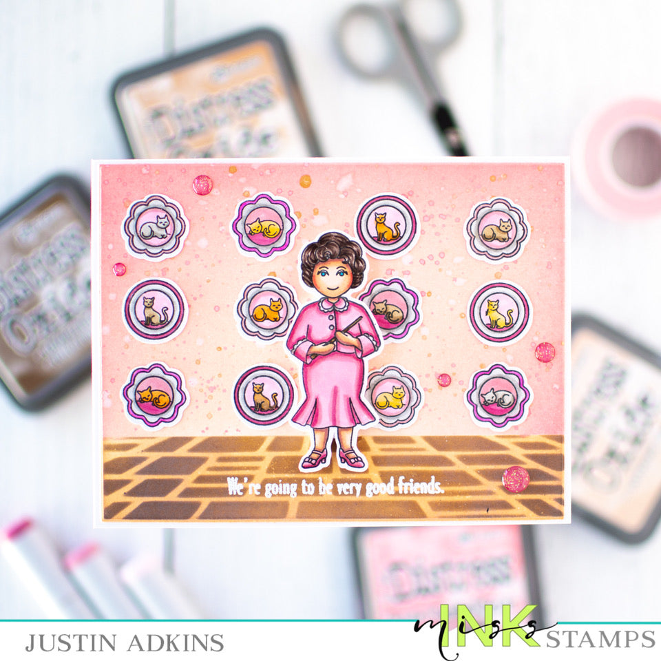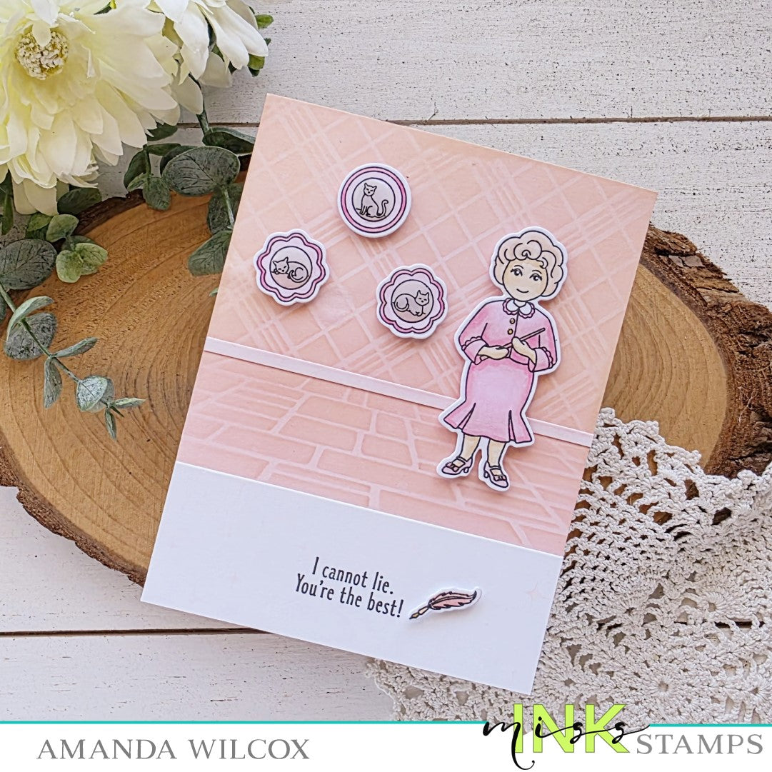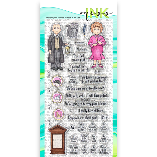 This set includes a female professor, a grumpy old guy and his cat, cat plates/pictures, and a bulletin board with a variety of sayings to fit it. This is a 4x8 inch clear stamp set.