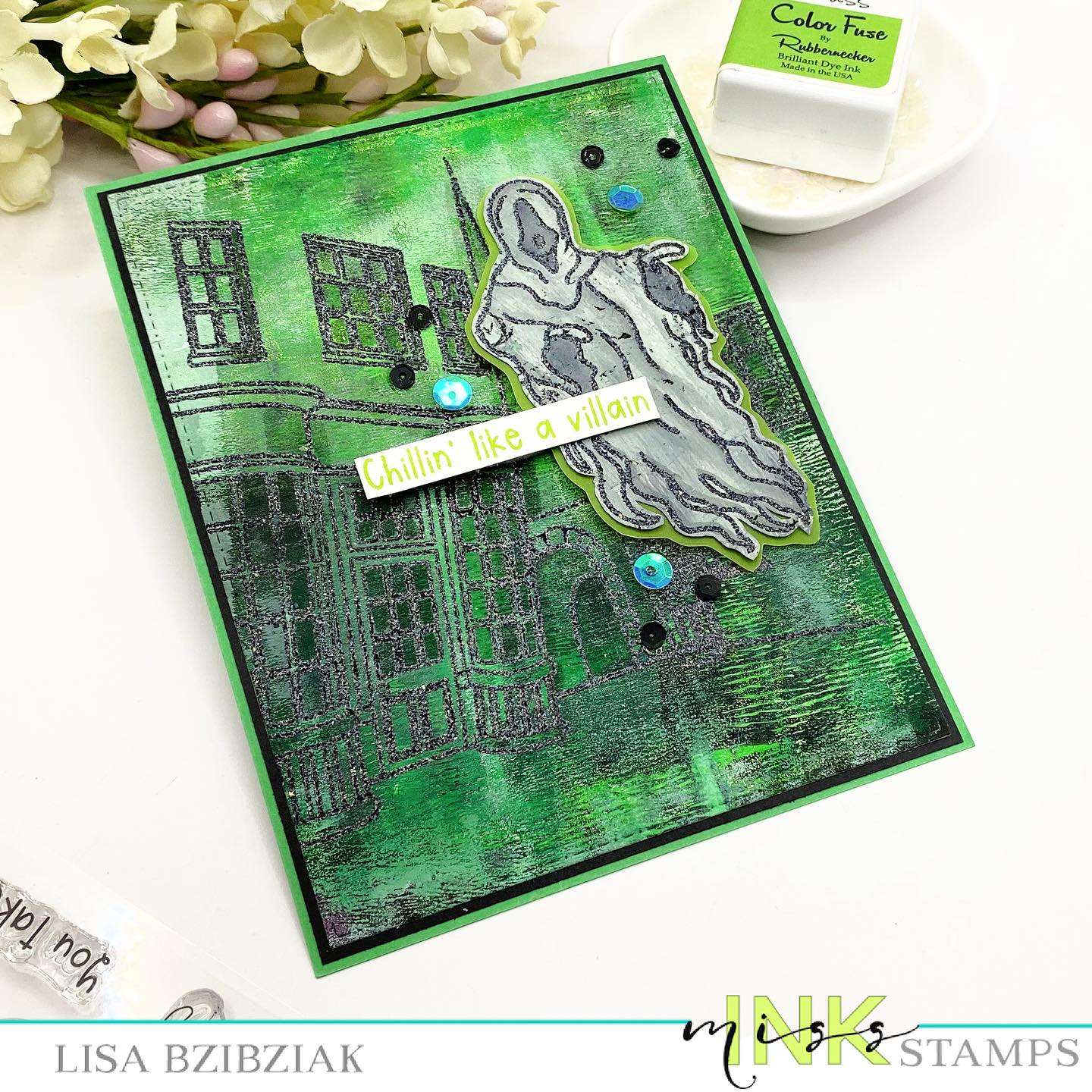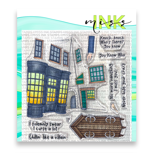 This scene building set includes a pointing hand sign, cabinet, bird, and a large alley scene with buildings, doors and windows. This is a 6x8 inch clear stamp set.
