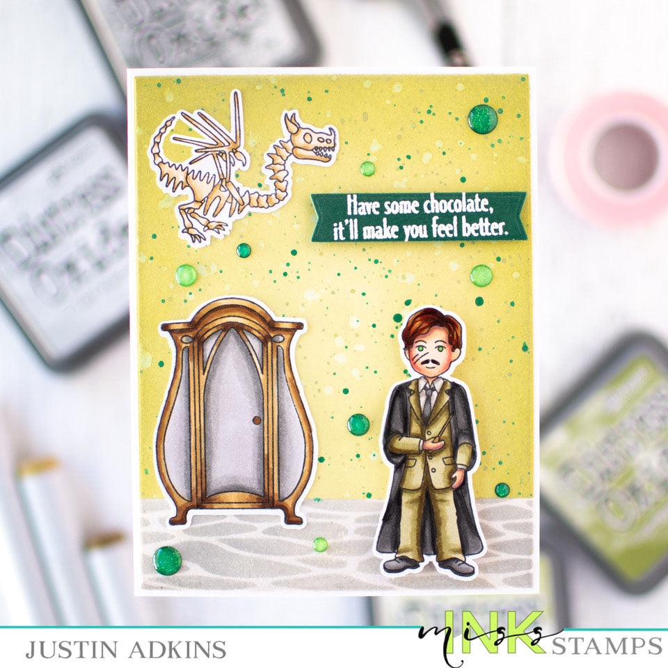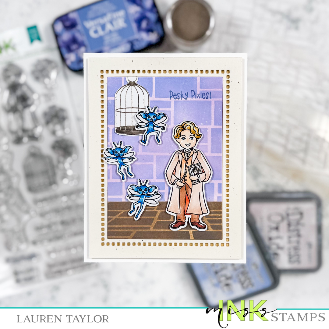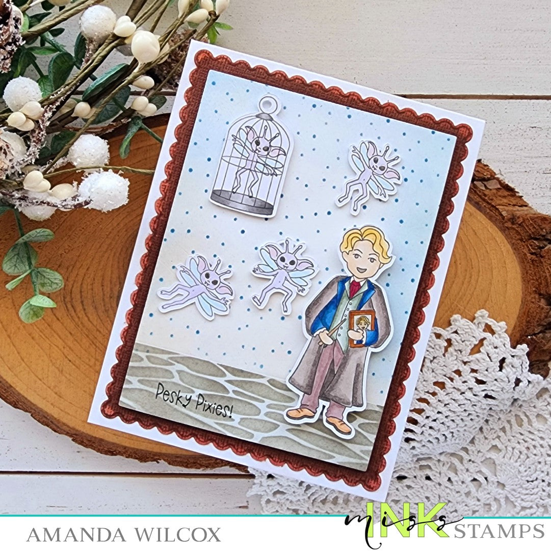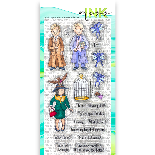 This set includes professors, pixies, a pixie cage, chocolate bar and a variety of sentiments. This is a 4x8 inch clear stamp set.
