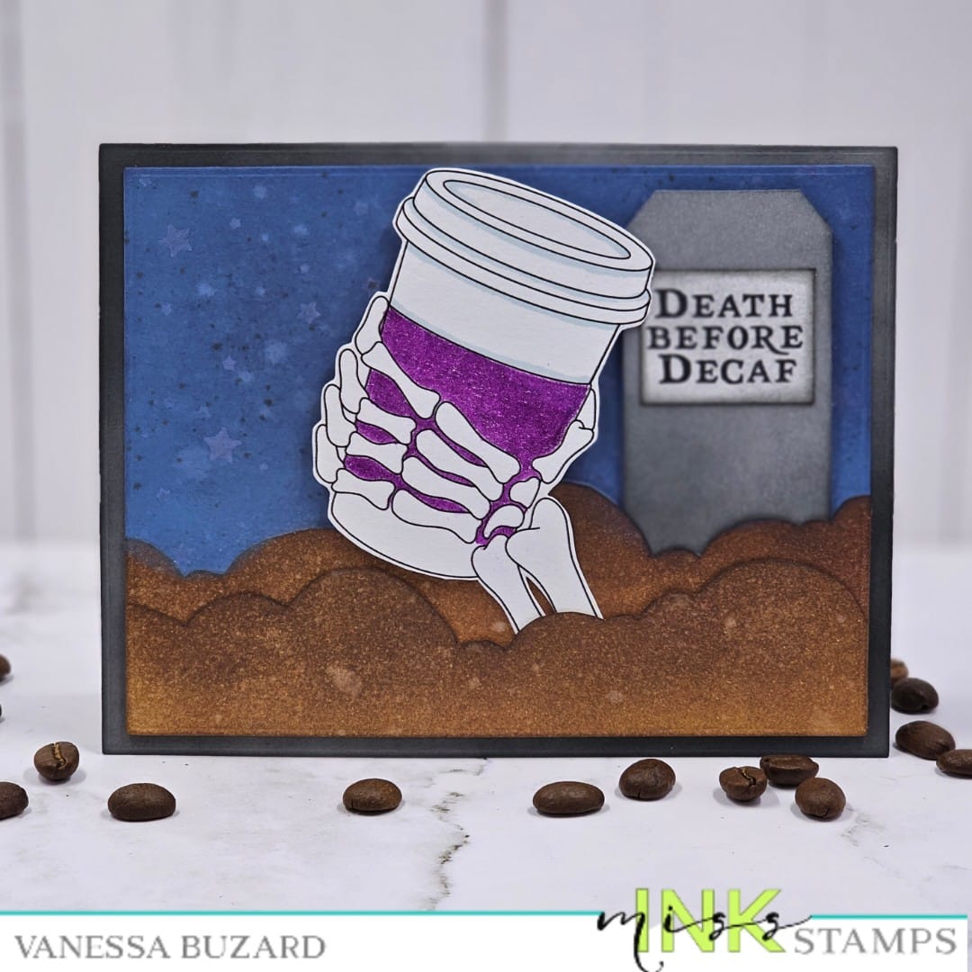 This 4x6" set has a skeleton sipping coffee and a bone hand holding a latte cup with 5 dramatic life and death coffee sentiments and some coffee bean accents.