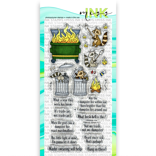 This snarky set is made for those crazy days. It has 4 cute raccoons, flies and trash, trash cans, a fiery dumpster, and lots of fun sentiments. This is a 4x8 inch clear stamp set.