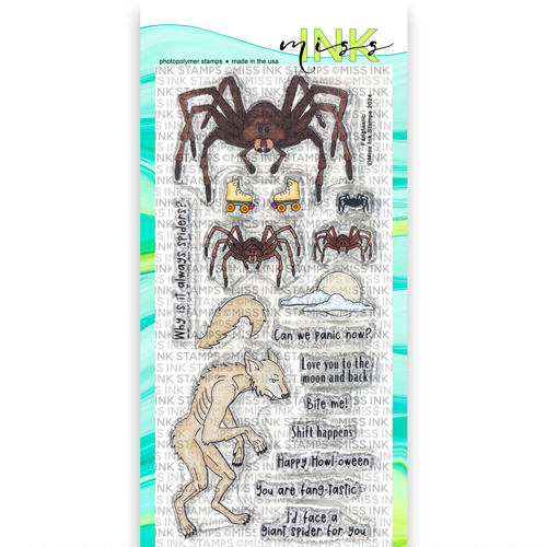 This 4x8 inch stamp set includes a giant spider with skates to fit, 3 smaller spiders, a werewolf, moon and a variety of sentiments.