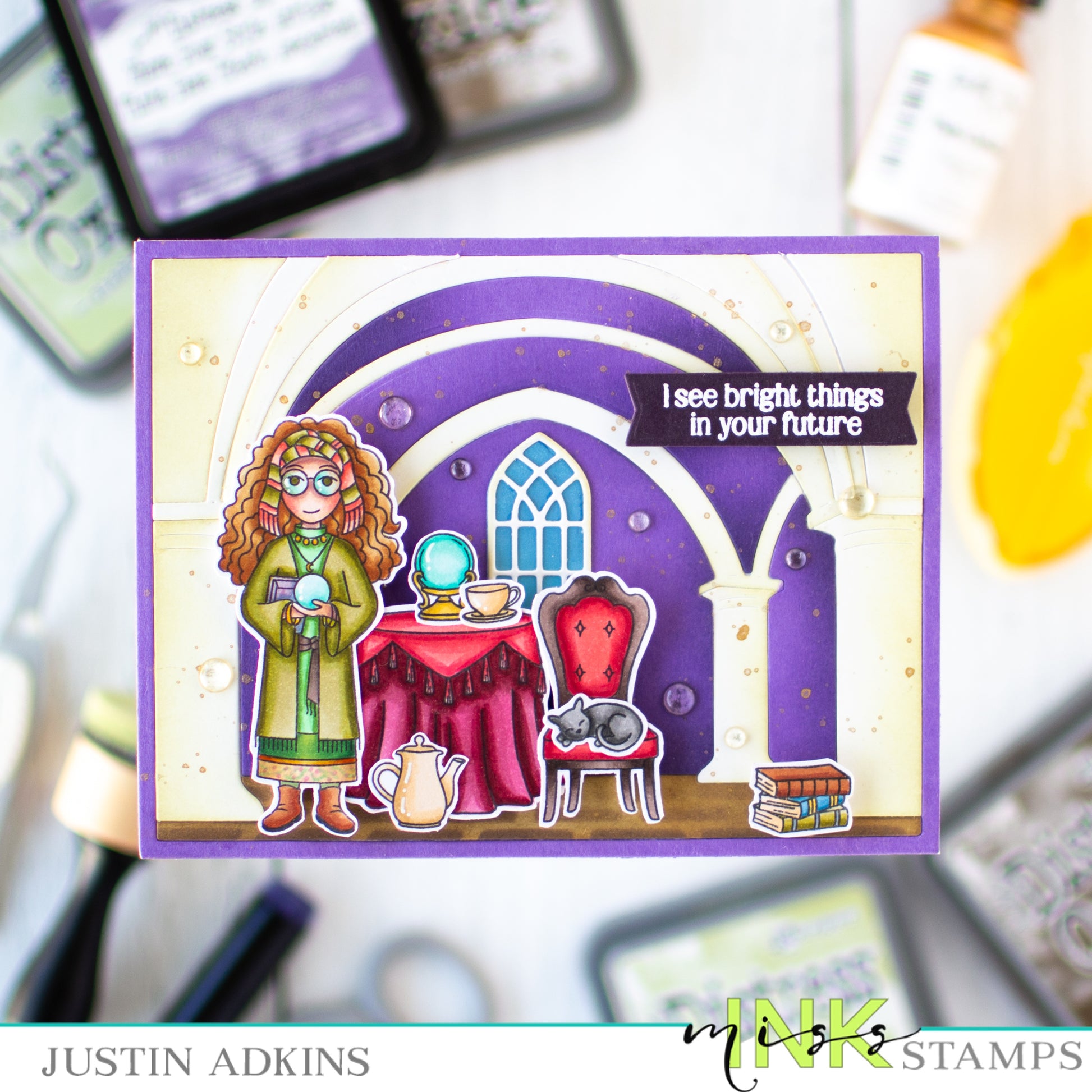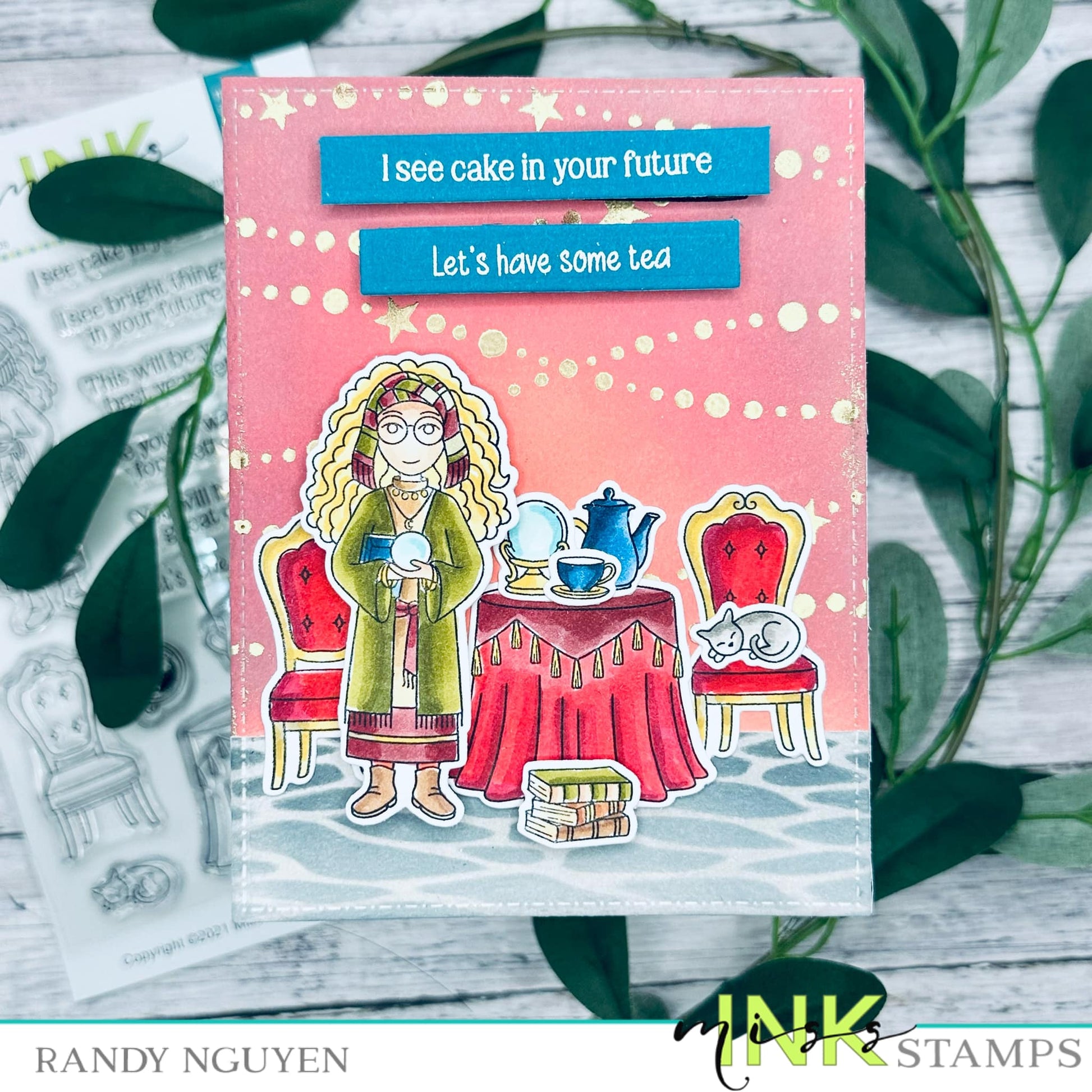 This 4x6 inch stamp set features a wide-eyed fortune teller and a variety of scene building elements and sentiments.