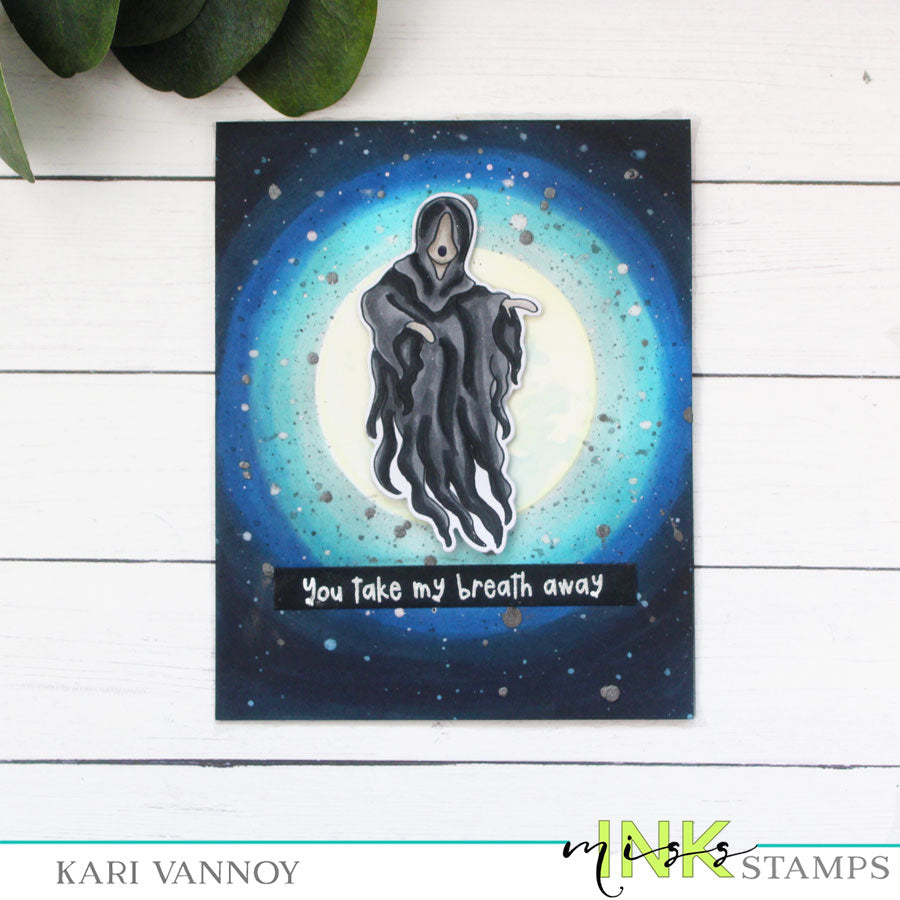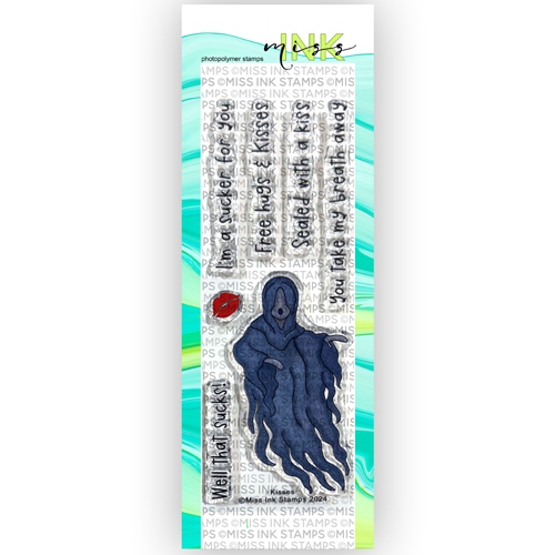 This set features a grim ghost that gives dangerous kisses, and includes 5 sentiments. This is a 2x6 inch clear stamp set.