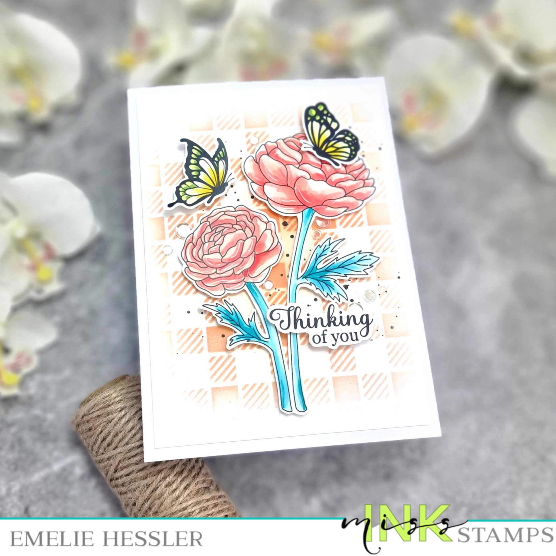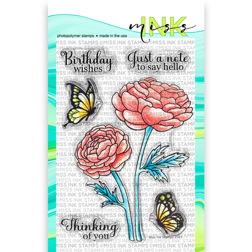 This 4x6 set features 2 ranunculus stems, butterflies and 3 sentiments.