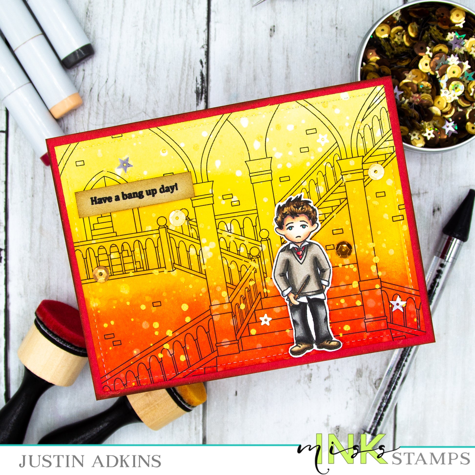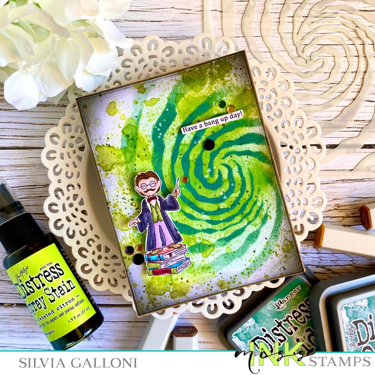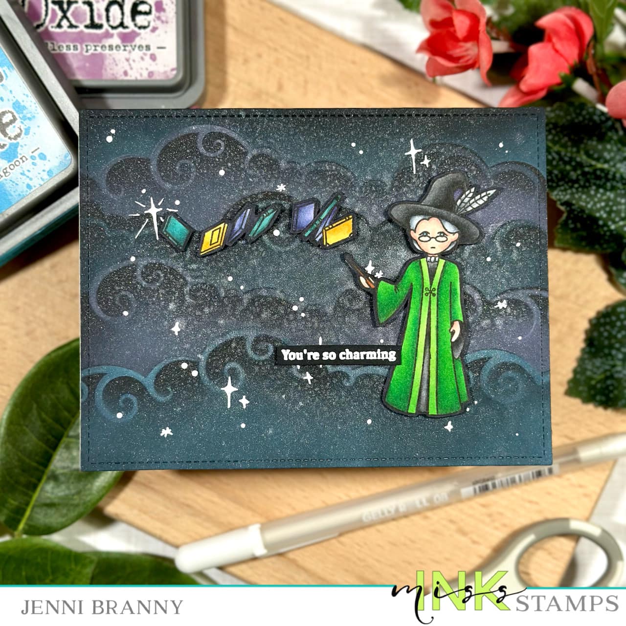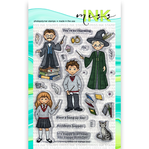 This charming stamp set has students and their professors practicing their magical arts. This is a 4x6 inch clear stamp set.