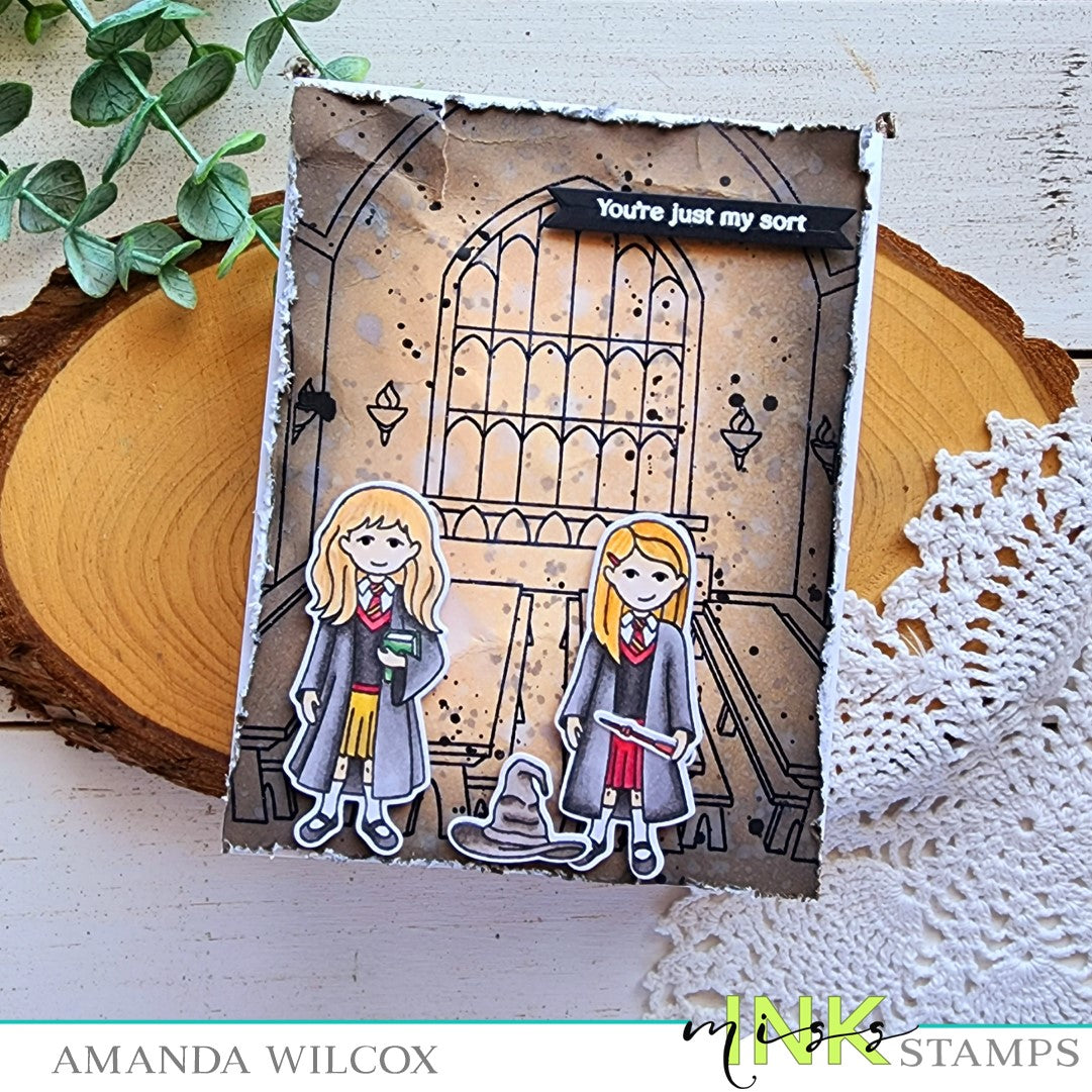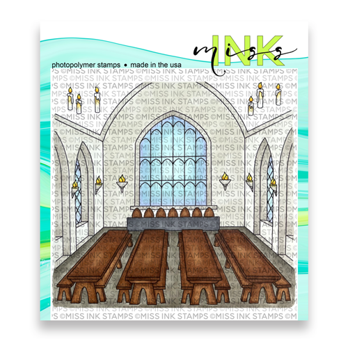This clear stamp set features a cathedral style banquet hall background and candles.