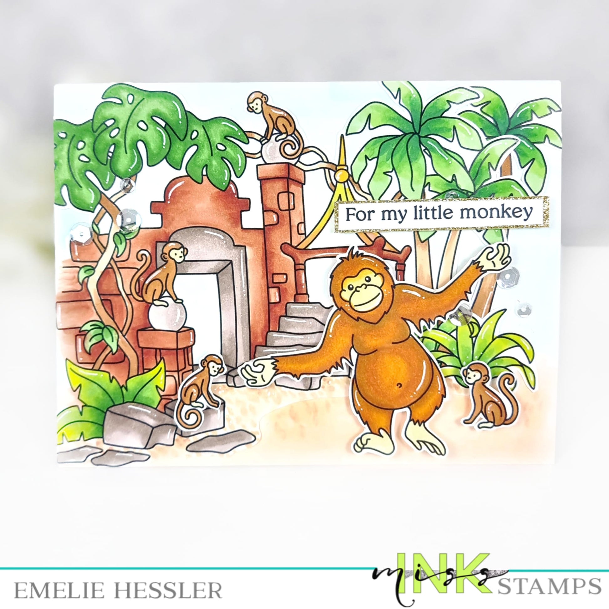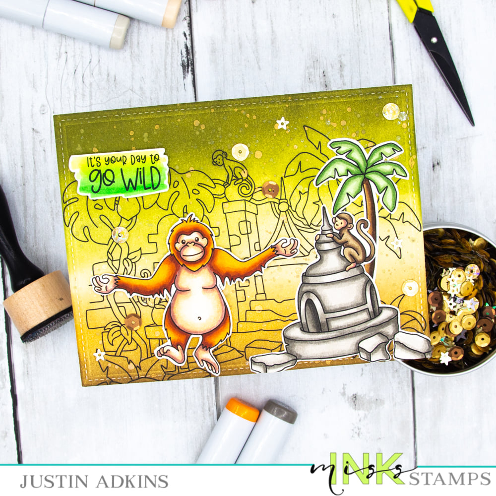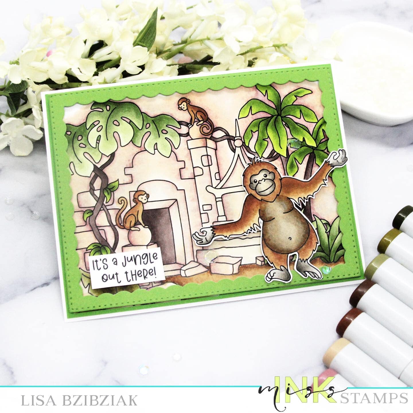 Jungle Ruins is a 6x8" set featuring large and small jungle ruins backgrounds, orangutan, monkeys, palm tree and sentiments.