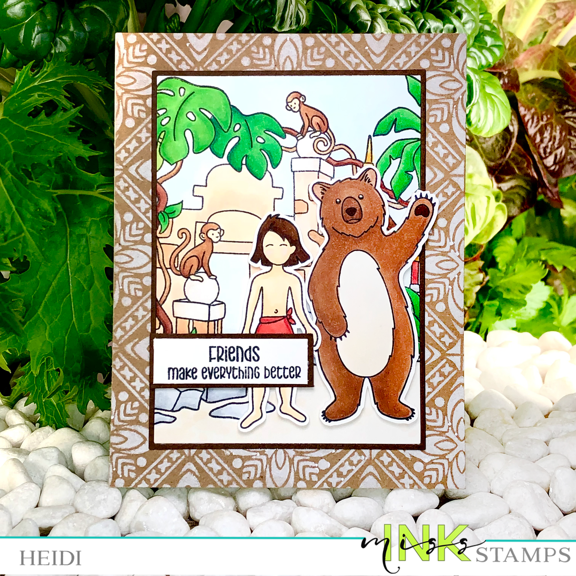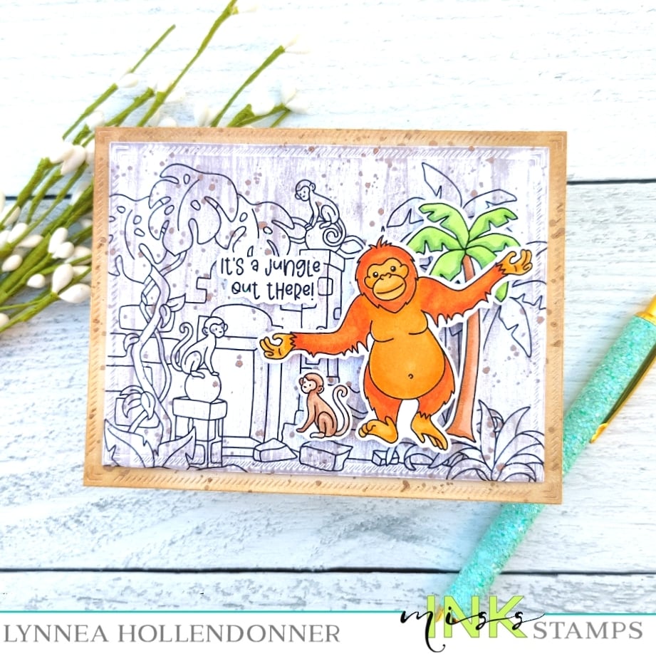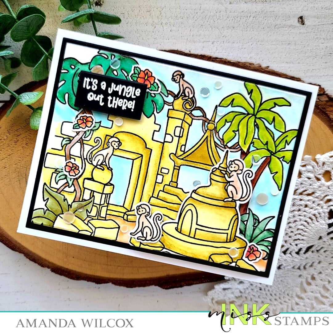 Jungle Ruins is a 6x8" set featuring large and small jungle ruins backgrounds, orangutan, monkeys, palm tree and sentiments.