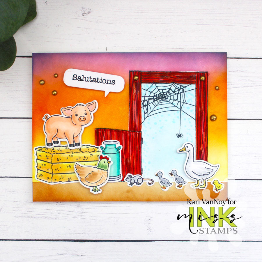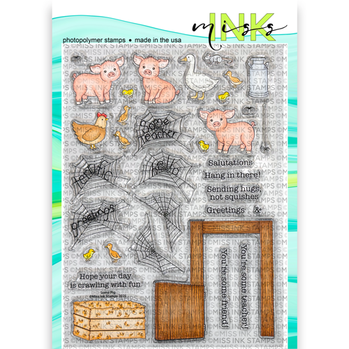 This sweet 6x8" set features a pig and his barnyard friends, a bard door, web elements, and a variety of sentiments.