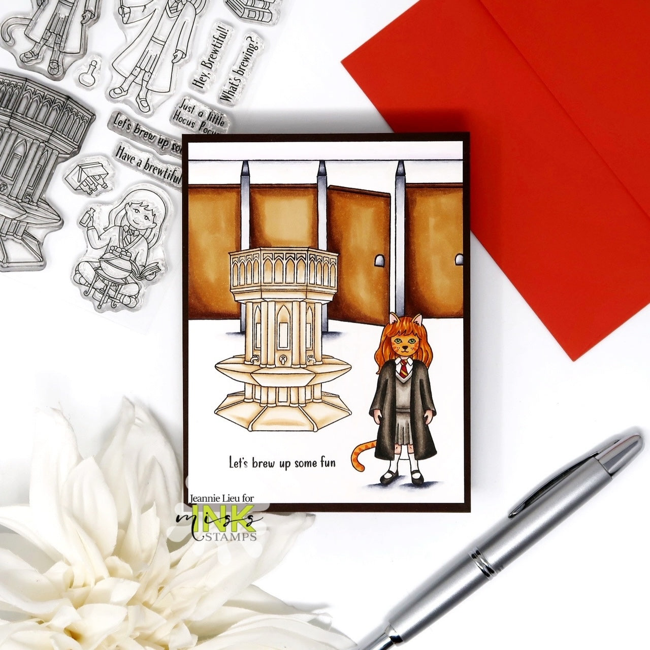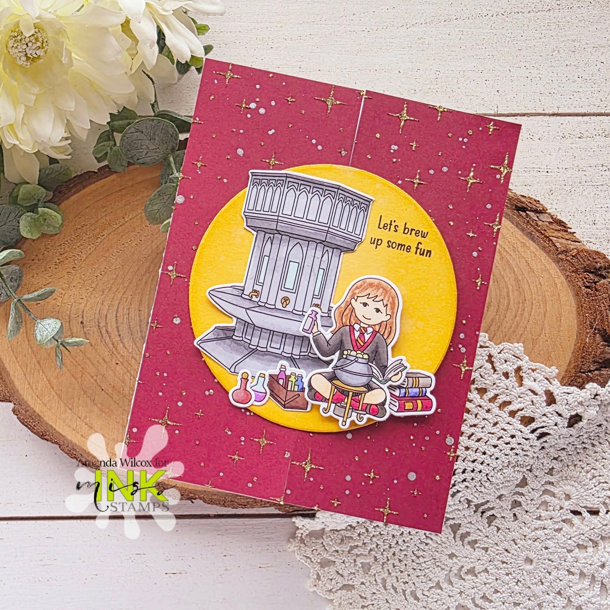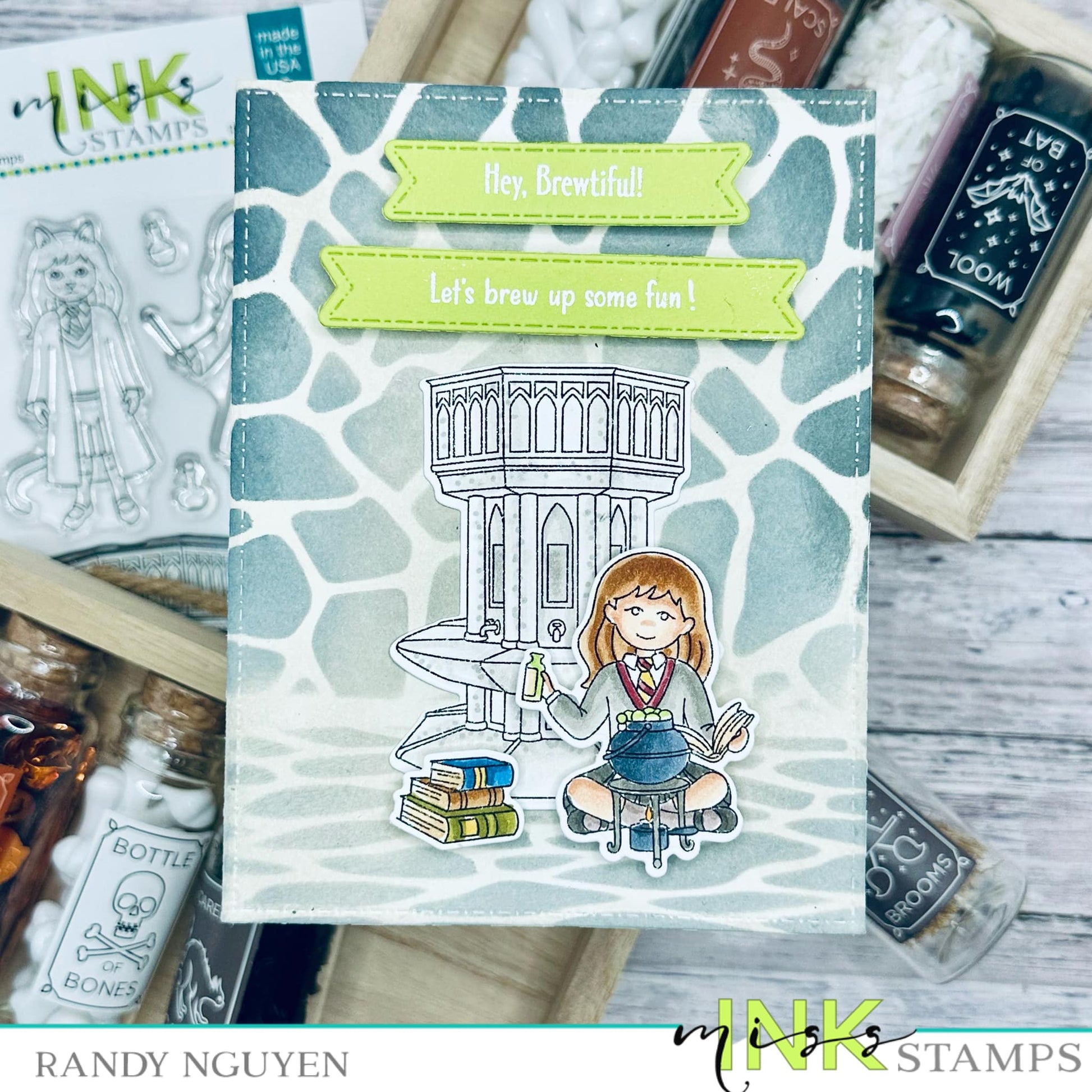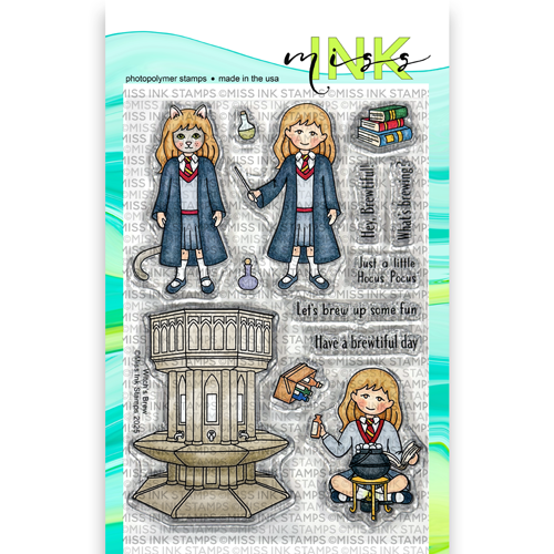 This 4x6 inch stamp set features a student witch practicing her potion making. It includes scene building elements and sentiments.